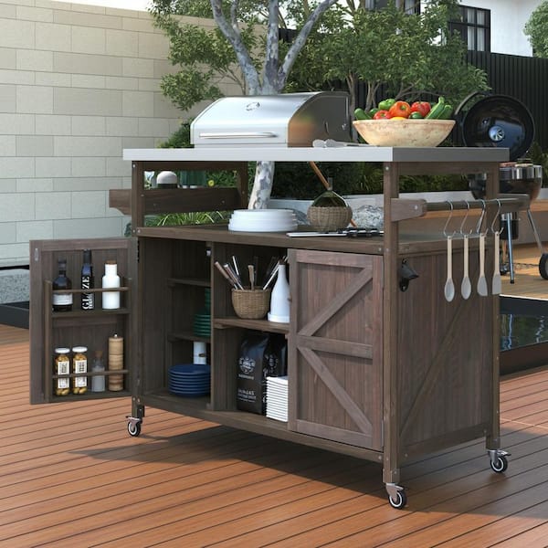 Farmhouse Dark Brown Stainless Steel 50 in. Outdoor Patio Grill Table Bar Cart Kitchen Island with Internal Storage Rack