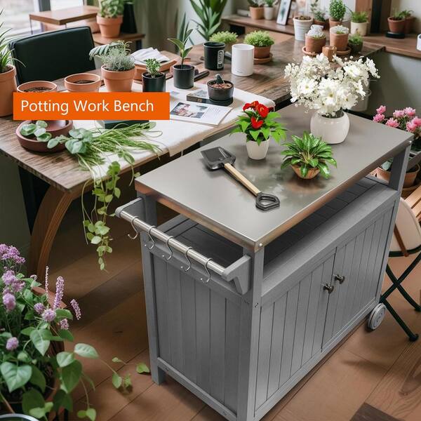 Gray Portable Outdoor Grill Cart Prep Table with Storage Waterproof Cabinet Stainless Steel Tabletop Kitchen Island