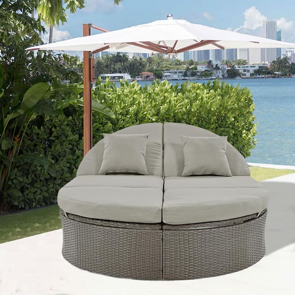 Luxury 2-Person Wicker Outdoor Day Bed with Gray Cushions and and Pillows, Adjustable Backrests and Foldable Cup Trays