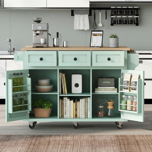 Mint Green Rubberwood 53.1 in. Drop-Leaf Kitchen Island Cart with Cabinet Door Internal Storage Racks and 3-Drawer