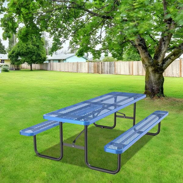 Outdoor 96 in. Blue Steel Rectangle Picnic Table Seats 6-10 People with Umbrella Pole