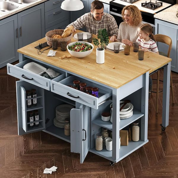 Rustic Gray Blue Wood 47.2 in. Internal Storage Rack Kitchen Island Extendable Dining Table with 2-Drawer and 2-Cabinet