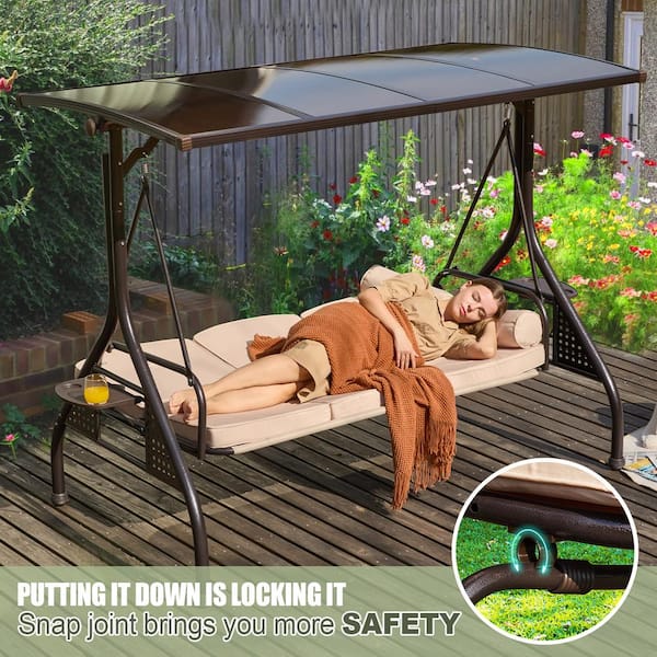 Steel Patio Swing with Cushions in Beige with Adjustable Canopy