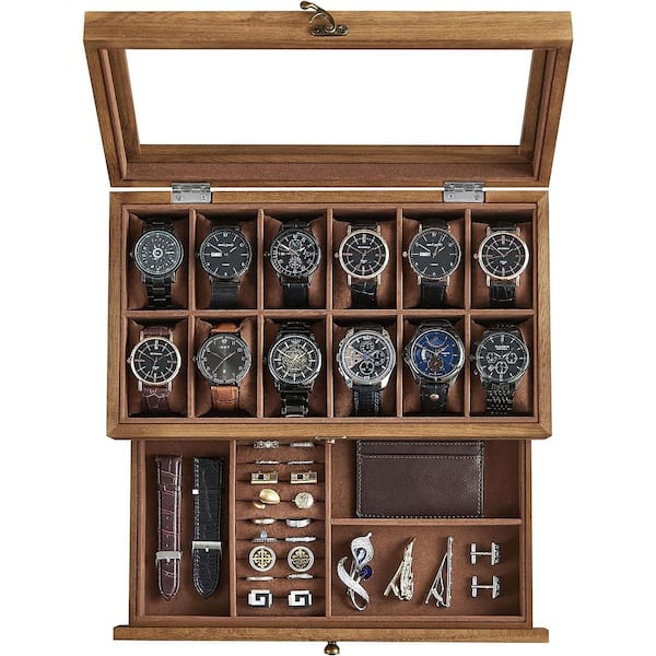 Rustic Walnut Wood 12-Slot 2 Layers Watch Box with Glass Lid