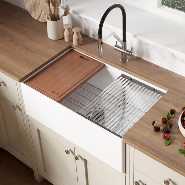 Fiore 30 in. Apron-Front Farmhouse Single Bowl White Fireclay Kitchen Sink and with Workstation Accessories