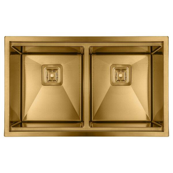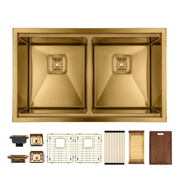 32 in. Undermount Double Bowl 16-Gauge Gold Hexagon Textured Stainless Steel Workstation Kitchen Sink with Accessories