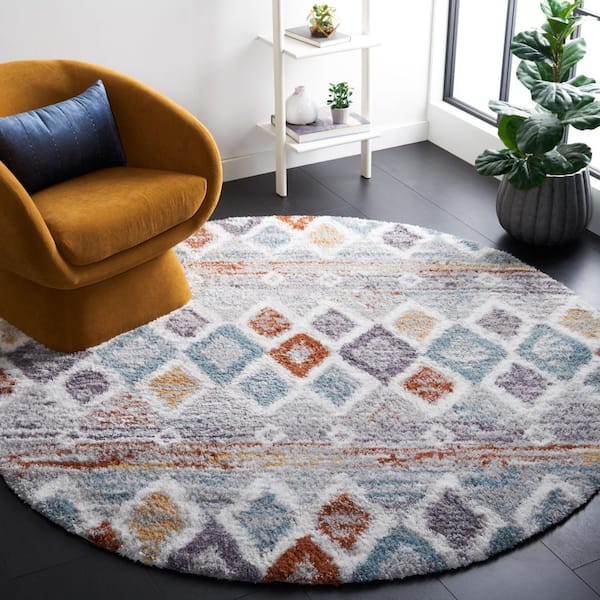 Berber Shag 8 ft. x 8 ft. Blue Rust/Ivory Diamond Striped Round Area Rug