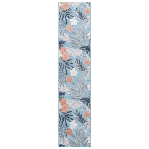 Cabana Blue/Gray 2 ft. x 9 ft. High-Low Leaf Floral Indoor/Outdoor Runner Rug