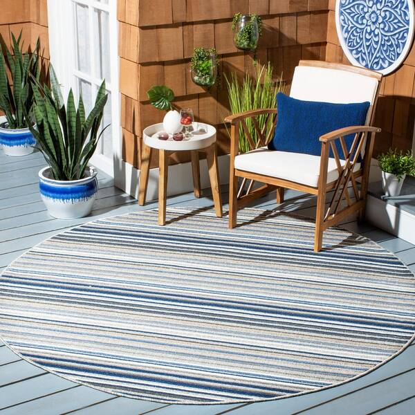 Cabana Gray/Blue 3 ft. x 3 ft. Striped Round Indoor/Outdoor Area Rug