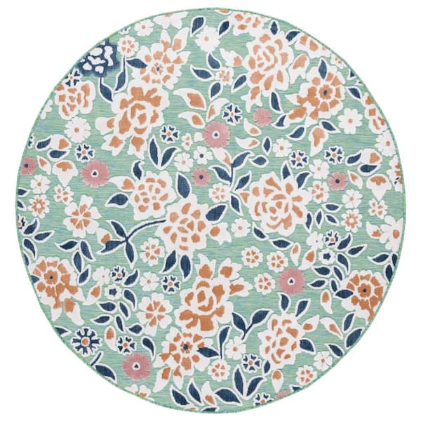 Cabana Green/Navy 4 ft. x 4 ft. High-Low Floral Round Indoor/Outdoor Area Rug