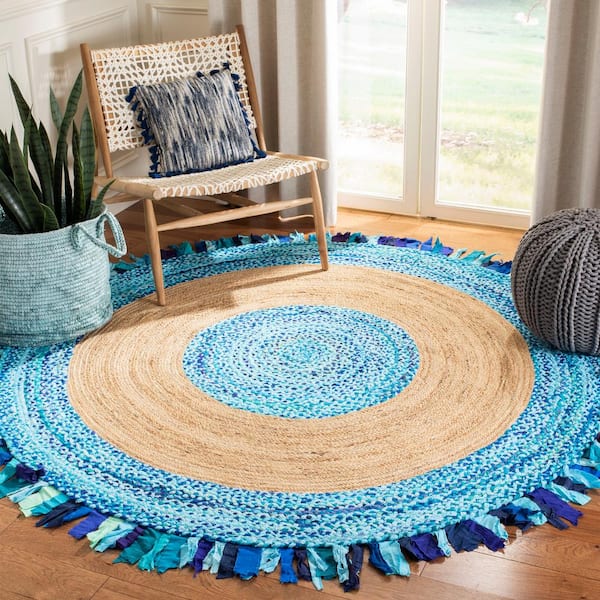 Cape Cod Turquoise/Natural 5 ft. x 5 ft. Round Striped Area Rug