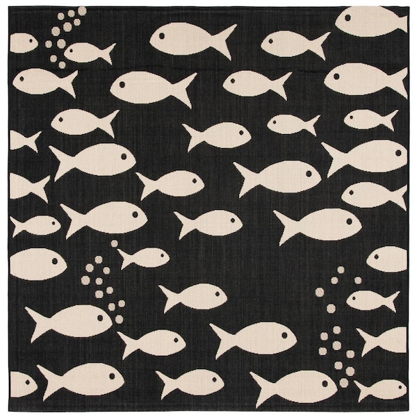 Courtyard Black/Beige 5 ft. x 5 ft. Novelty Fish Indoor/Outdoor Patio Square Area Rug