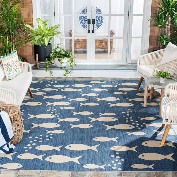 Courtyard Blue/Beige 7 ft. x 7 ft. Novelty Fish Indoor/Outdoor Patio Square Area Rug