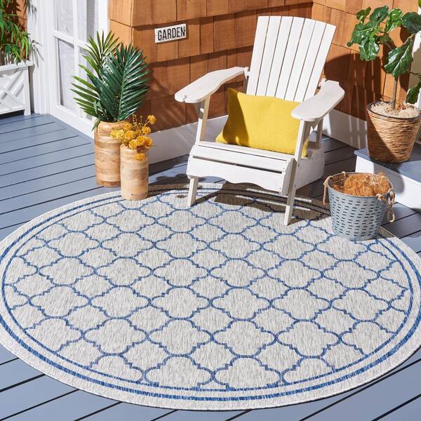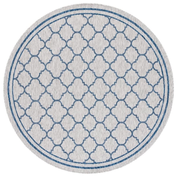 Courtyard Gray/Navy 7 ft. Round Border Quatrefoil Indoor/Outdoor Area Rug