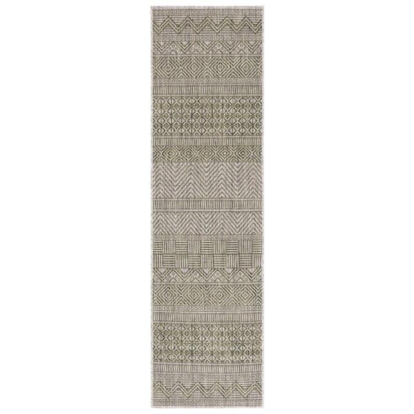 Courtyard Gray/Olive Green 2 ft. x 8 ft. Striped Tribal Chevron Indoor/Outdoor Runner Rug