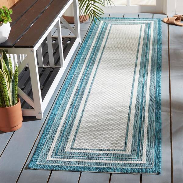 Courtyard Ivory/Teal 2 ft. x 7 ft. Solid Color Striped Indoor/Outdoor Runner Rug