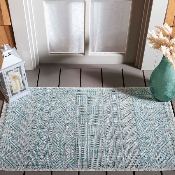 Courtyard Light Gray/Aqua 3 ft. x 5 ft. Striped Tribal Chevron Indoor/Outdoor Area Rug