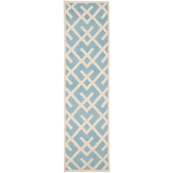 Dhurries Light Blue/Ivory 3 ft. x 8 ft. Border Geometric Runner Rug