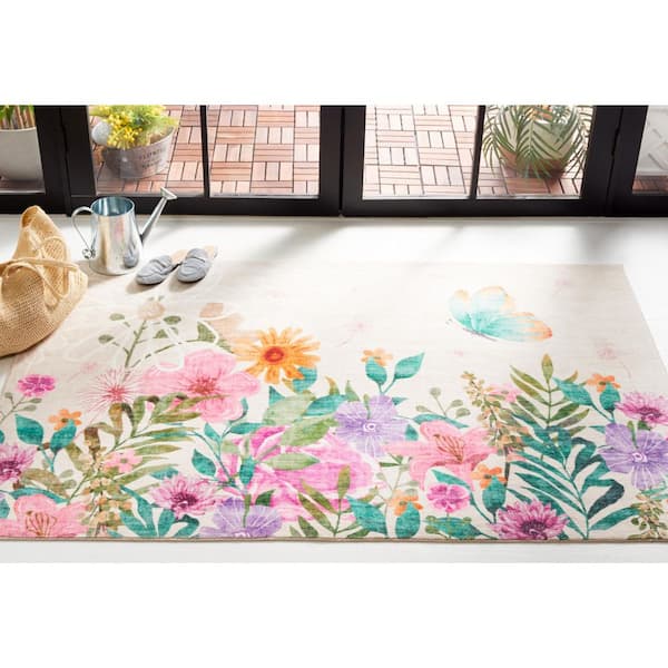 Door And Kitchen Mat Ivory/Pink 4 ft. x 6 ft. Machine Washable Floral Garden Area Rug