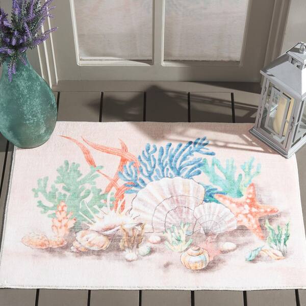 Door and Kitchen Mat Peach/Green 2 ft. x 4 ft. Machine Washable Coral Area Rug