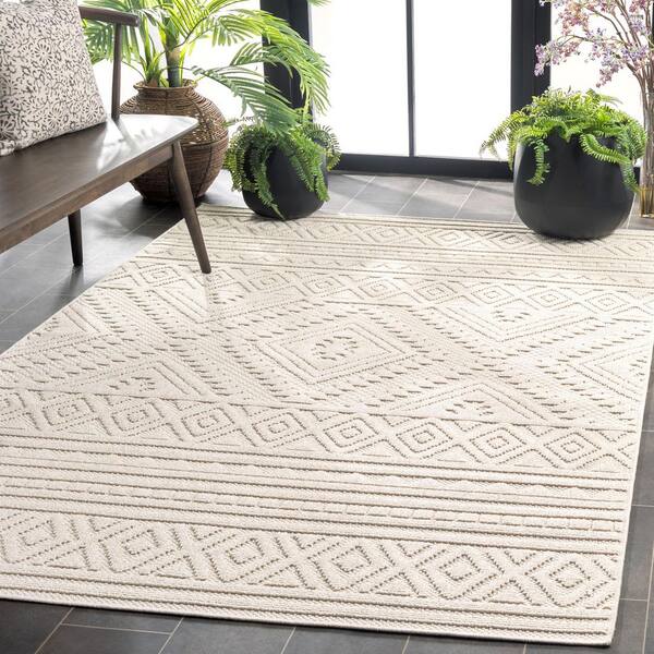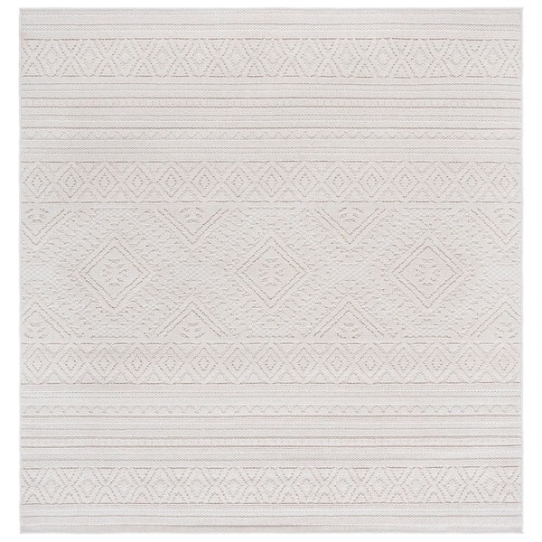 Global Light Beige/Ivory 7 ft. x 7 ft. Solid Striped Diamond square Indoor/Outdoor Area Rug