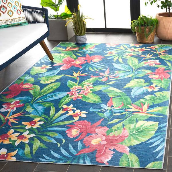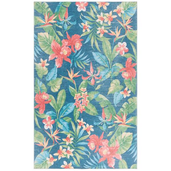 Malibu Dark Blue/Green 3 ft. x 5 ft. Machine Washable Botanical Leaf Area Rug