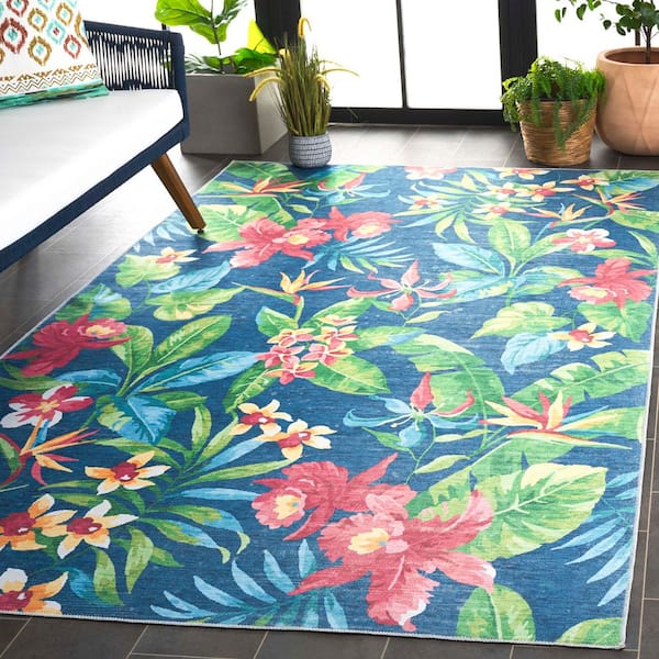 Malibu Dark Blue/Green 9 ft. x 12 ft. Machine Washable Botanical Leaf Area Rug
