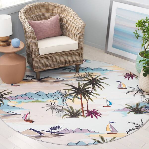 Malibu Ivory/Taupe 6 ft. x 6 ft. Machine Washable Tropical Round Area Rug
