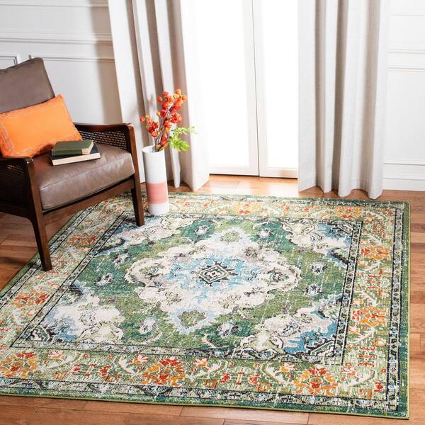 Monaco 5 ft. x 5 ft. Forest Green/Light Blue Distressed Border Medallion Square Area Rug