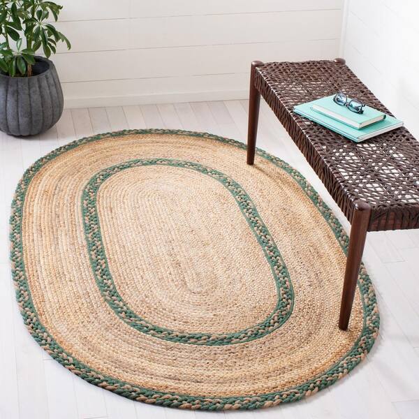 Natural Fiber Beige/Green 5 ft. x 8 ft. Border Woven Oval Area Rug