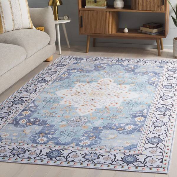 Tucson Aqua/Light Blue 5 ft. x 8 ft. Machine Washable Ornate Border Area Rug