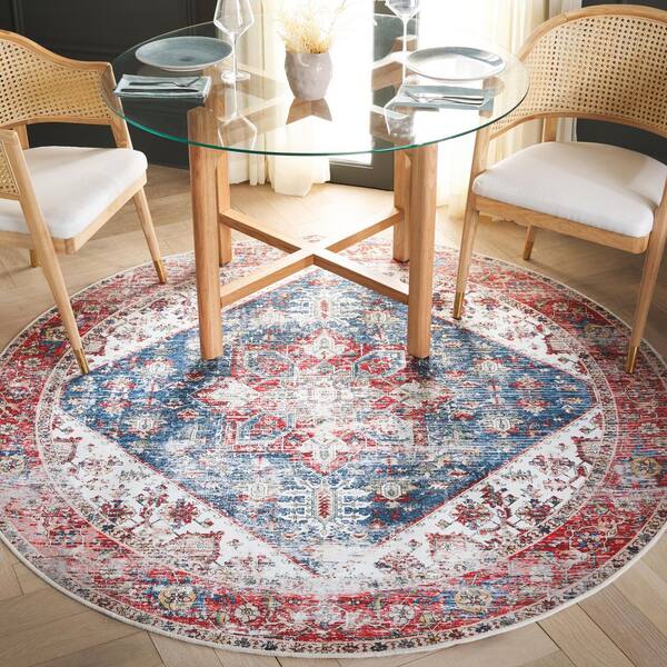 Tucson Blue/Red 7 ft. x 7 ft. Machine Washable Distressed Ornate Border Round Area Rug
