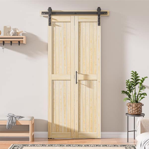 Assembled 44 in. x 84 in. Solid Core Unfinished Pine Wood Bi-Fold Door With Hardware Kit