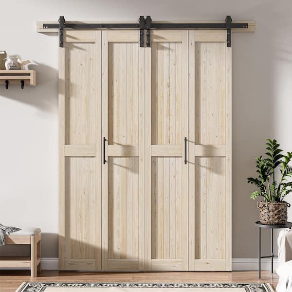 Assembled 80 in. x 84 in. Solid Core Unfinished Pine Wood Bi-Fold Door with Hardware Kit