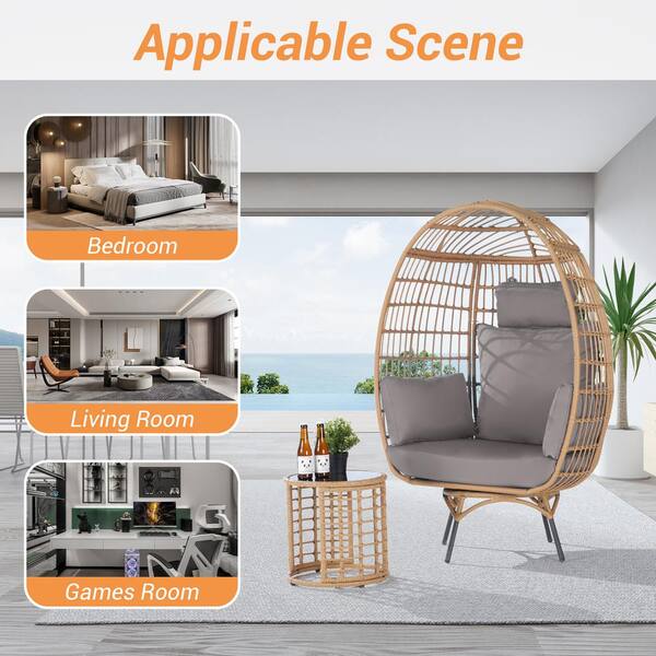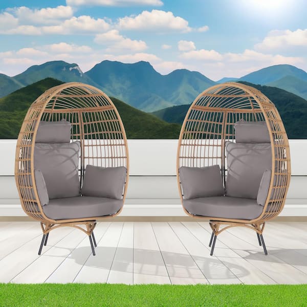 2-Pieces Patio Wicker Swivel Egg Chair, Oversized Indoor Outdoor Egg Chair, Brown Rattan Light Gray Cushions