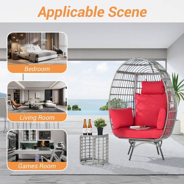 2-Pieces Patio Wicker Swivel Egg Chair, Oversized Indoor Outdoor Egg Chair, Gray Rattan Red Cushions