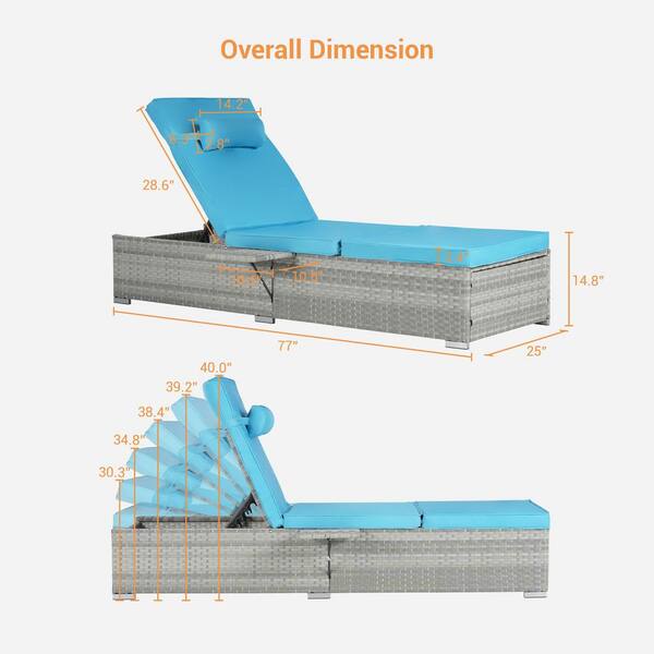 2-piece Patio Chaise Lounge Chairs, Rattan Reclining Chair Adjustable Backrest with Lake Blue Cushion