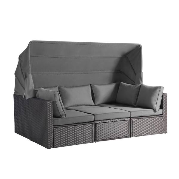 4-Piece Patio Rattan Daybed Set with Retractable Canopy, Gray Soft Cushions and Versatile Coffee Table