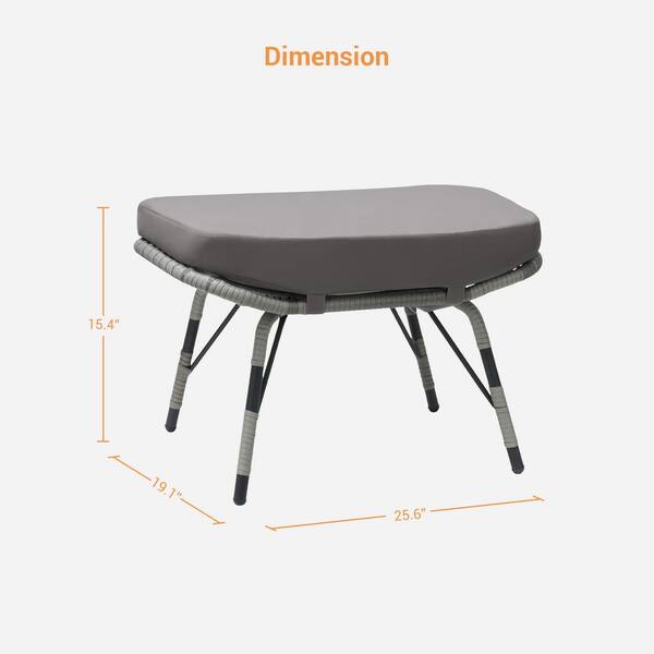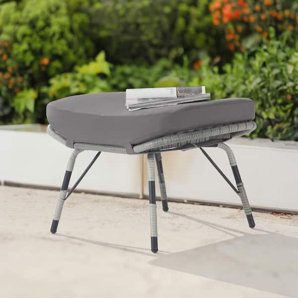 Gray Wicker All Weather Rattan Outdoor Ottoman with Removable Gray Cushions