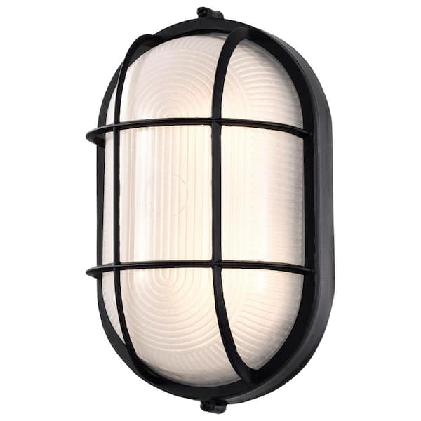 Nuvo 11.03 in. x 6.46 in. Black Hardwired Integrated LED Bulkhead Light with White Glass Shade