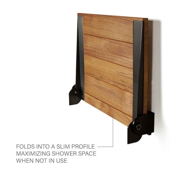 SlimLine Natural Teak Wood Wall Mount Folding Shower Seat Bench with Matte Black Frame