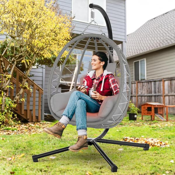 Grey Patio Hanging Basket Heated Egg Chair with Stand, Rattan Wicker Swing Chair with UV Resistant Cushion and Pillow