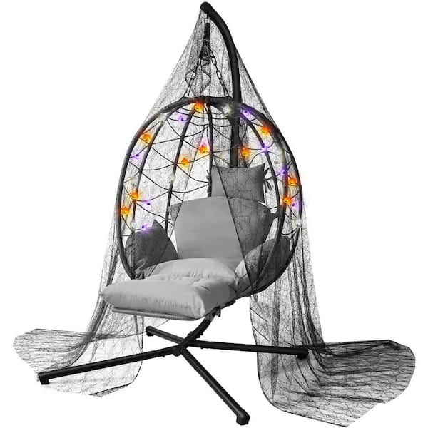 Oyajia Patio Halloween Grey Rattan Wicker Swing Single Egg Chair with Halloween Spider Cloth and String Lights