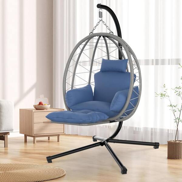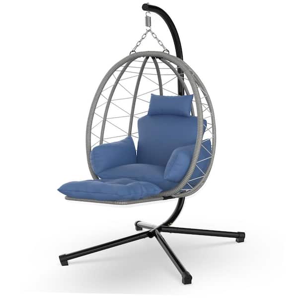 Patio Hanging Basket Egg Chair Rattan Wicker Outdoor Lounge Swing Chair with UV Resistant Blue Cushion and Pillow