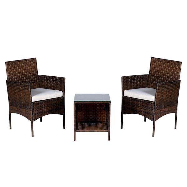 SERGA.3-Piece PE Rattan Outdoor Patio Conversation Sofa Set with 2 Chairs, 1 Table And White Cushion