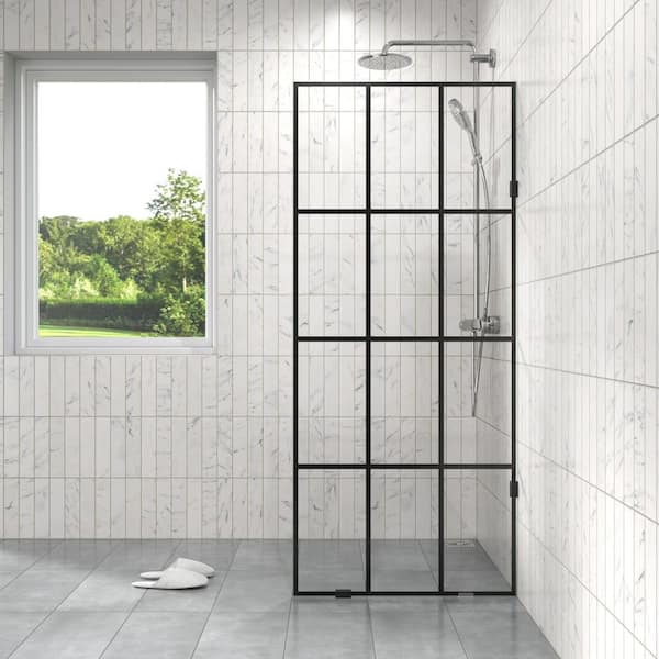 34 in. W x 78 in. H Frameless Fixed Single Panel Shower Screen Door in Black Grid Pattern with 3/8 in.(10mm) Clear Glass