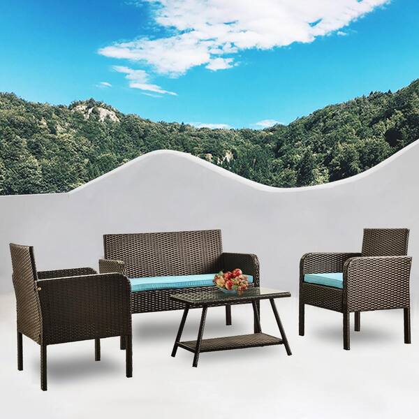 SIMPLE LIFE 4-Piece Wicker Terrace Patio Conversation Sofa Seating Set with Blue Cushion
