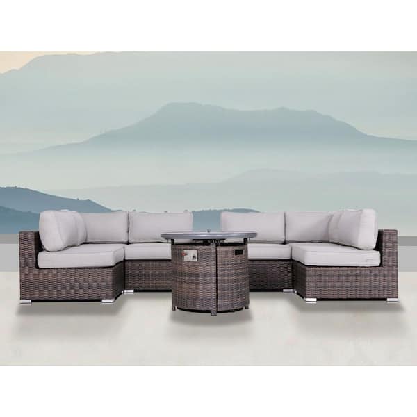8 Piece Sectional Seating Group with Olefin Grey Cushions & Firepit