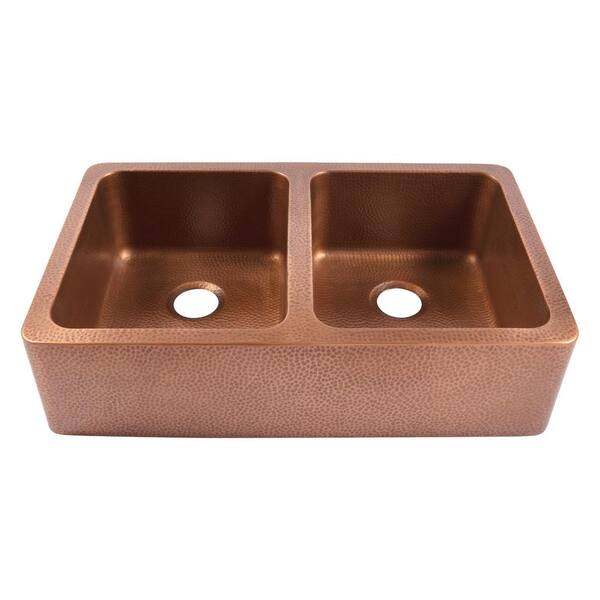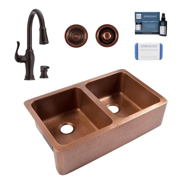 Adams 36 in. Farmhouse Apron Undermount Double Bowl 16 Gauge Antique Copper Kitchen Sink with Maren Bronze Faucet Kit
