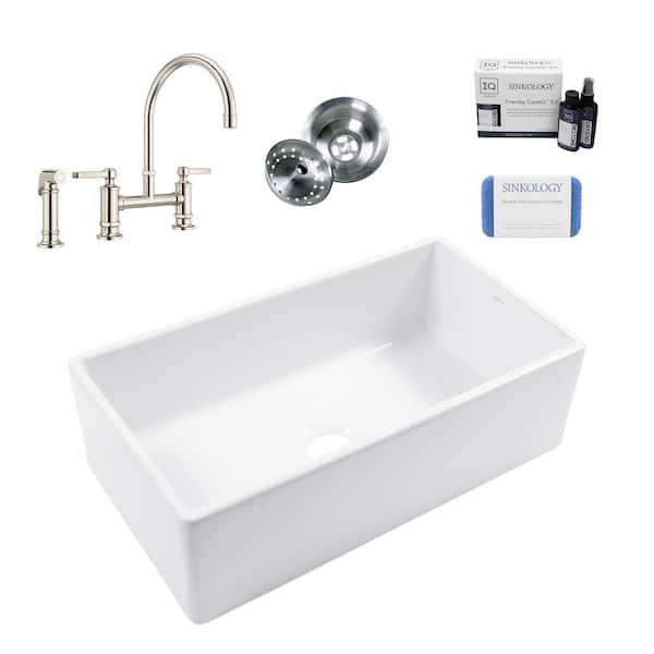 Bradstreet II 33 in. Farmhouse Apron Front Undermount Single Bowl White Fireclay Kitchen Sink with Nickel Faucet Kit